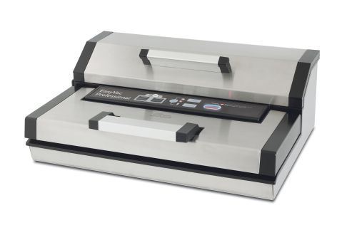 Der Easy VAC Professional hat ein solides Gehäuse aus Edelstahl. Mit vollautomatischem Vakuumiersystem und vielen, individuellen Einstellmöglichkeiten. Lebensmittel bleiben bis zu 4x länger frisch – ohne Konservierungsstoffe. So gibt es spezielle Beutel für zwei Betriebsarten, für trockene (“Dry”) und feuchte (Moist”) Lebensmittel. Und so einfach geht das: Legen Sie das Vakuumiergut in einen original SOLIS- Vakuumierbeutel, gemäss Anleitung ins Gerät einlegen und die entsprechende Einstellung programmieren. Die Taste “VACUUM+SEAL” drücken und alles läuft nun mit der dreistufig einstellbaren Verschweisszeit vollautomatisch – auch für feuchte Lebensmittel. Es besteht aber auch die Möglichkeit, den Vakuumiervorgang jederzeit zu unterbrechen, indem Sie die Taste “SEAL” drücken. Das Gerät reagiert dann sofort und beginnt mit dem Verschweissen des Beutels. Geeignet sind bis zu 30 cm breite Beutel und Folien. Als weiteres hat er den Schlauchanschluss zur Vakuumerzeugung in Behältern mit genialer Marinierfunktion. Behälter sind als Zubehör erhältlich. Ein Fach für Folienrolle mit Rollenschneider ist integriert. Farbe: Edelstahl/schwarz, Leistung: 180 Watt, Gewicht: 4,65 kg, Maße (B x H x T) ca: 42,5 x 16,0 x 28,5 cm.